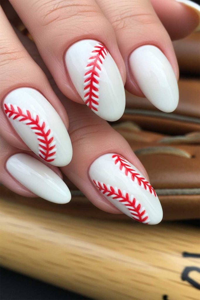 Raised stitching using gel for a realistic texture. A smooth white or nude base coat on all nails. Raised red stitching is sculpted using thick gel or 3D gel paint, curved vertically like a real baseball seam. The textured stitches catch light and shadow, adding a tactile, realistic finish to the sporty design.