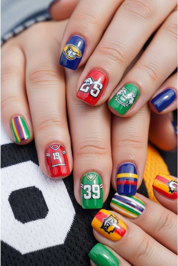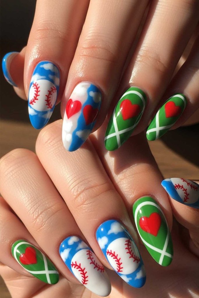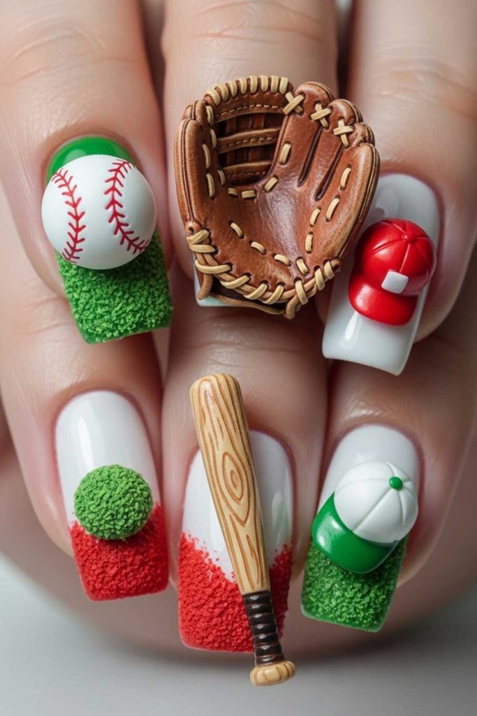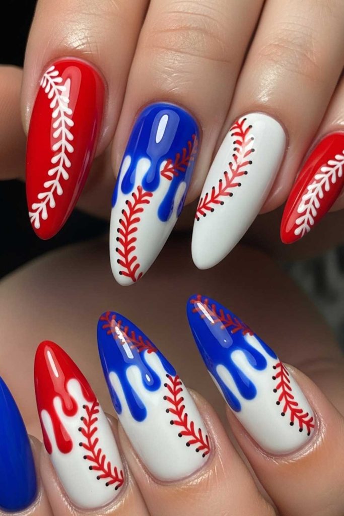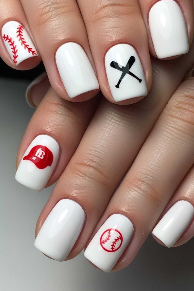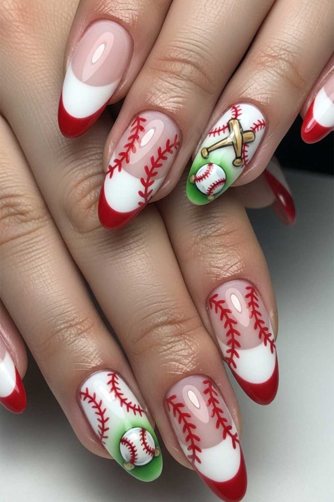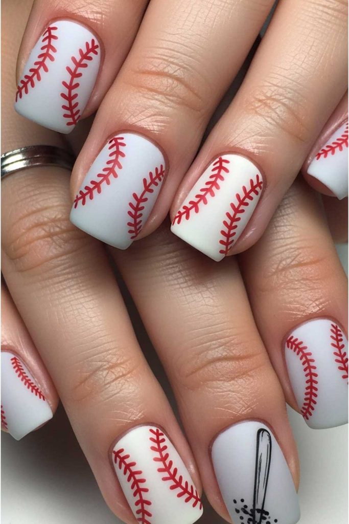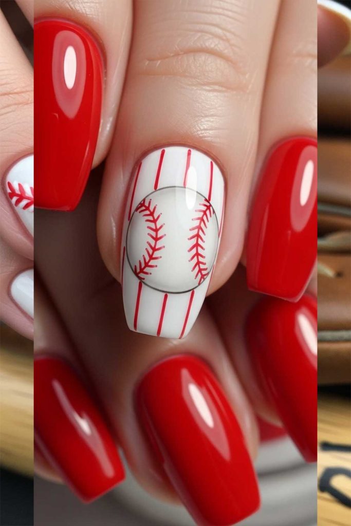 Add silver or red glitter with baseball accents for a glam look. A sparkling base of silver or red glitter on all nails for a glamorous finish. One or two accent nails feature curved white or red baseball stitches painted directly over the glitter. Top with a high-shine gloss to blend sporty details with party-ready shine.