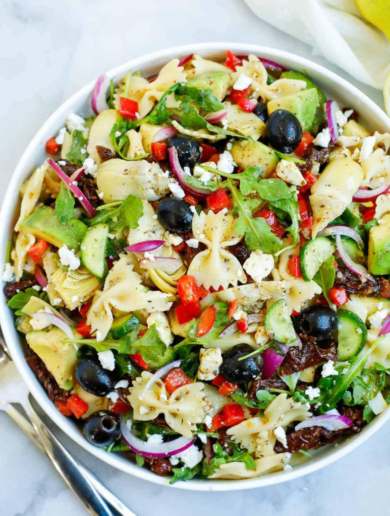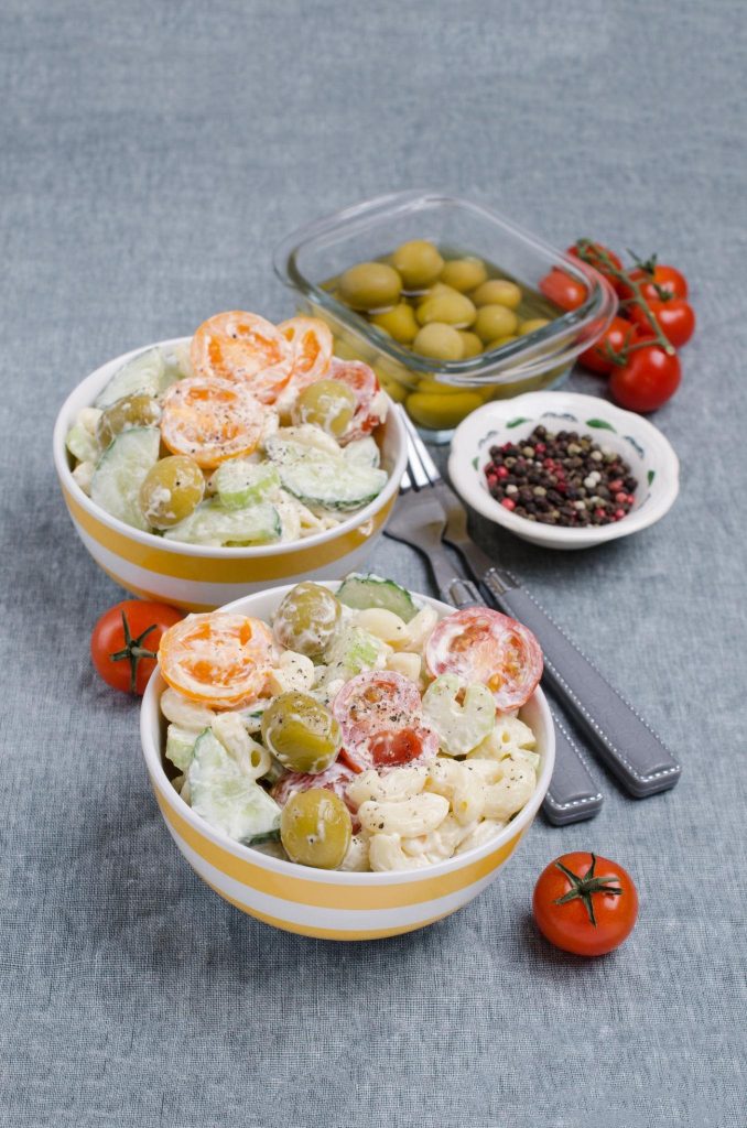 - In a large mixing bowl, combine pasta, veggies, olives, and cheese.
