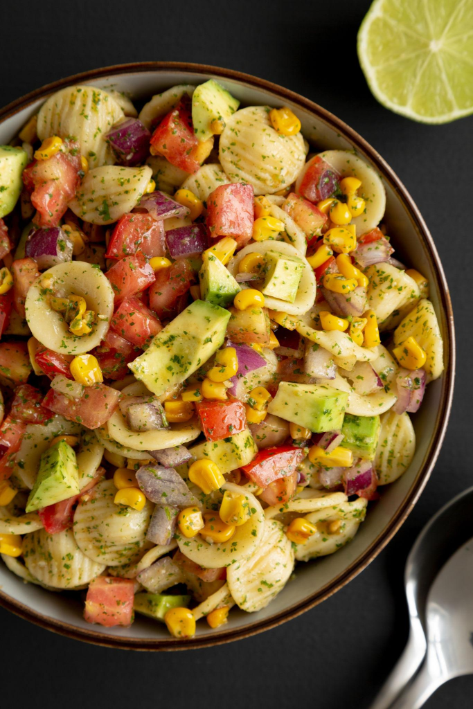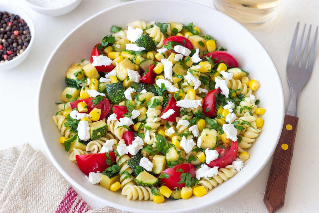 - In a large bowl, combine pasta, corn, tomatoes, and vegetables.